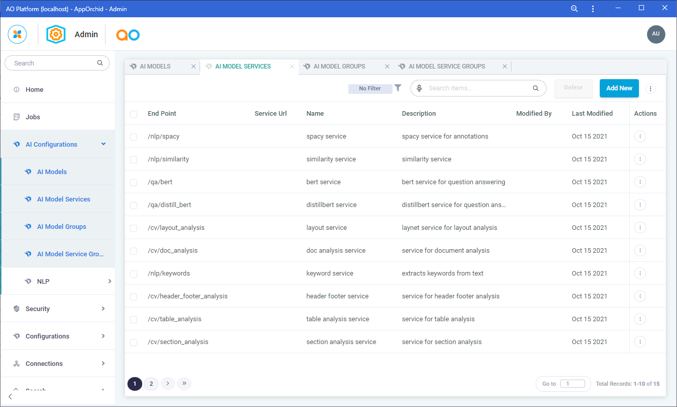 The AI Configurations pages allow the user to configure options for AI Models, Groups and Services as well as NLP configurations.