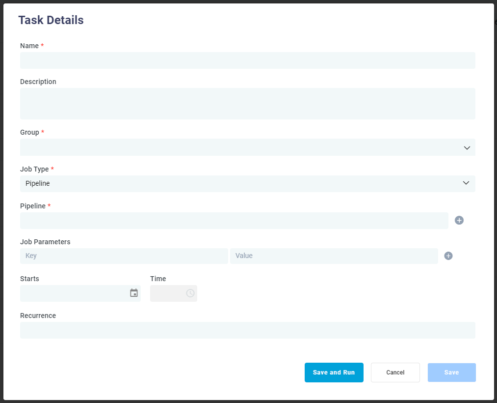 The Jobs page allows the user to create/edit Tasks that will execute based on a configured schedule (once scheduled, the Task becomes a Job). The most common Task type is a Pipeline, ie a process where data is read (from a data source), often transformed/enriched, and then loaded into another staging storage system (using a data sink) for use by the application components in a solution. Another common Task type is a clean-up task. This can be based on some retention policies that require some data to be deleted due to privacy or security requirements in general, - or just for general housekeeping/health of the system.