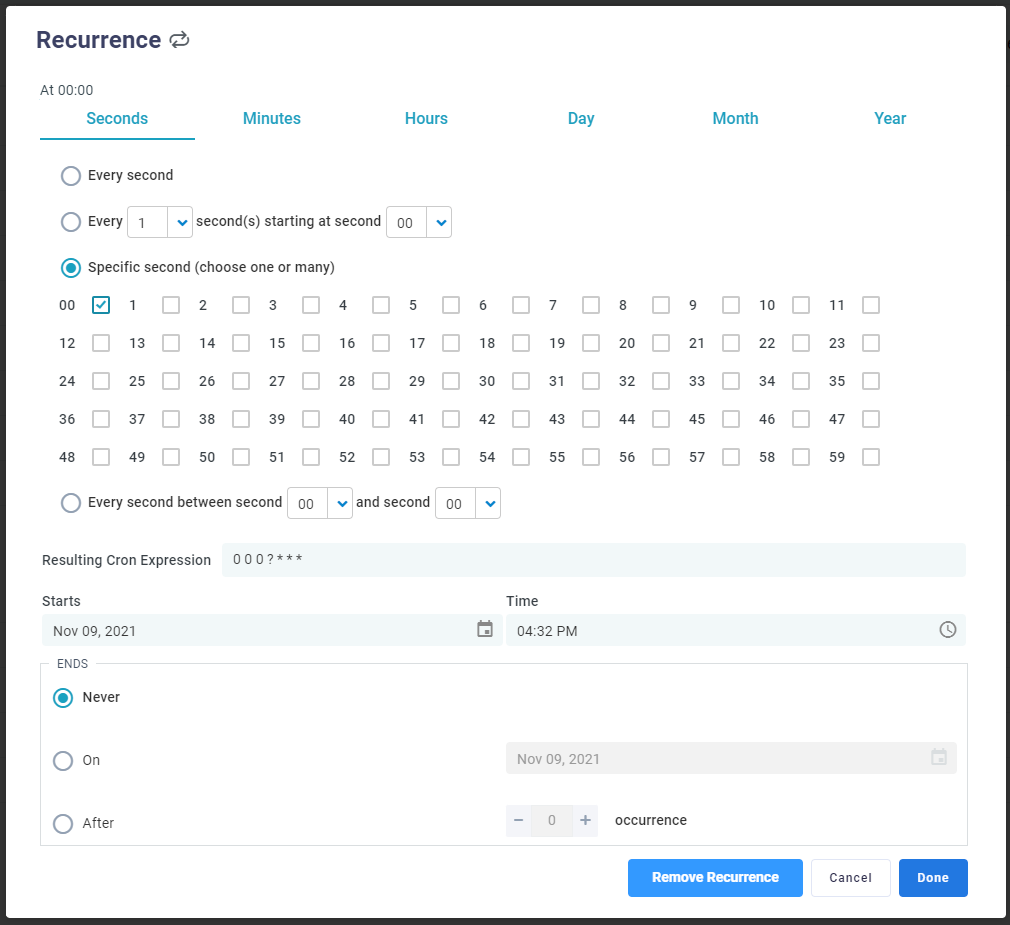 A Job can either be set to run once (without recurrence) or a recurrence can be provided - see second screenshot