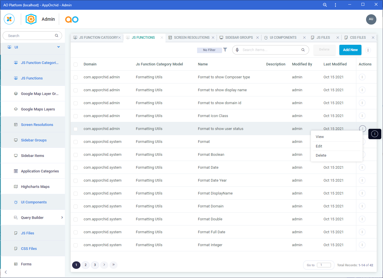 View JS Functions - views the JS Function for the selected JS Function Group.