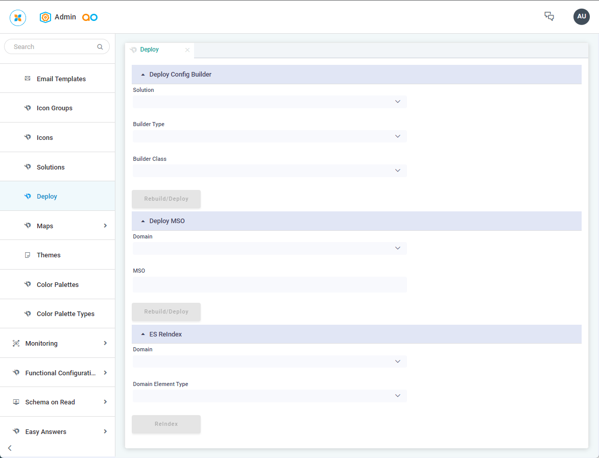 The Deploy page allows the Administrator to Rebuild or Deploy Config Builders or MSOs, and/or Reindex a Domain Element Type in Elasticsearch.