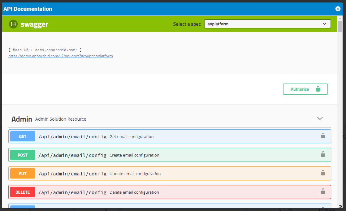 Access via App Orchid Demo Server: https://demo.apporchid.com/swagger-ui.html?groups=aoplatform
