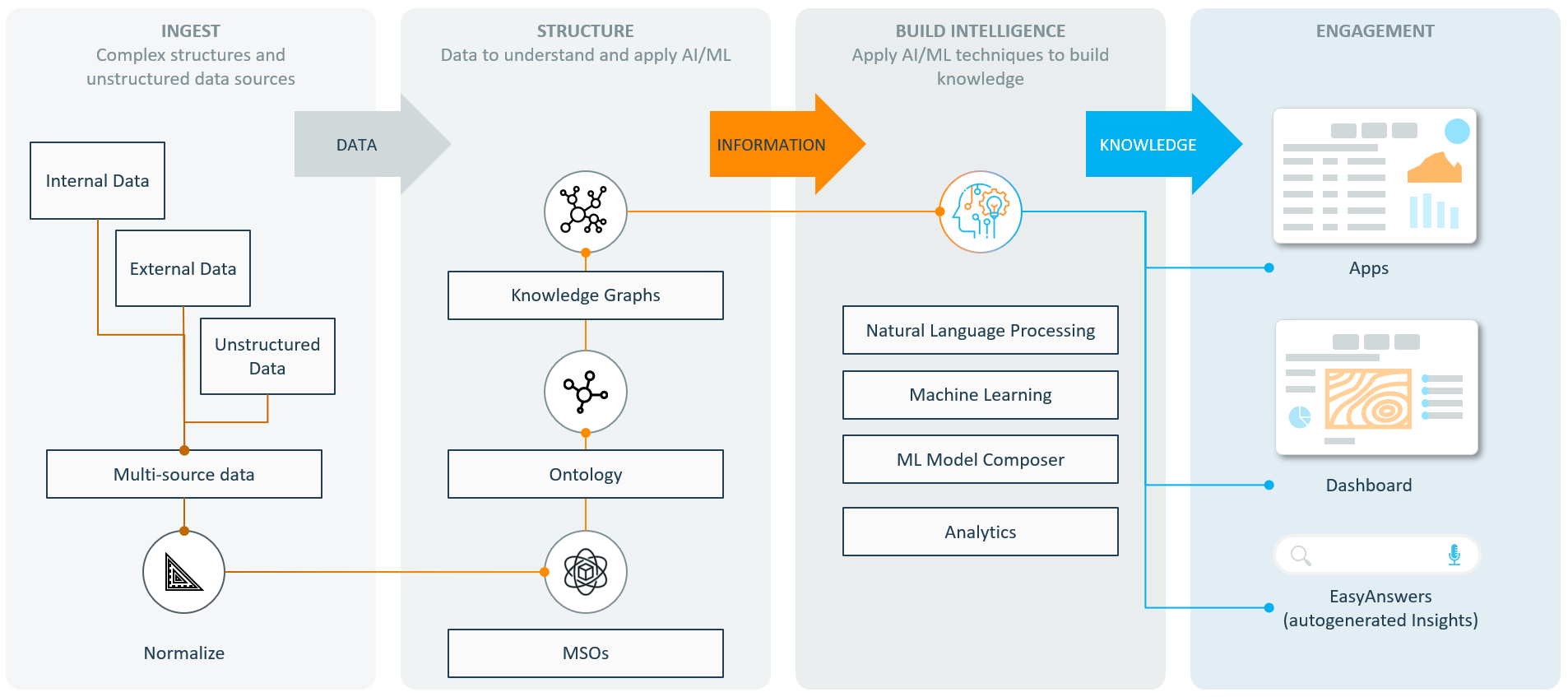 By combining all the tribal knowledge, the raw data, and the AI-extracted metadata into a knowledge graph, and using natural language questions (NLQ) as the intuitive way to ask questions of your data, the AO Platform delivers intelligent answers in minutes.