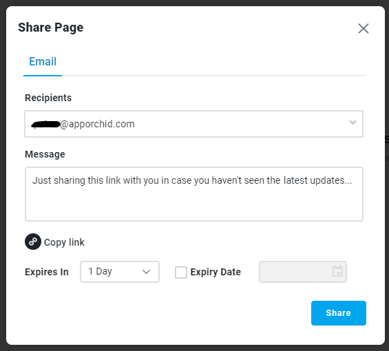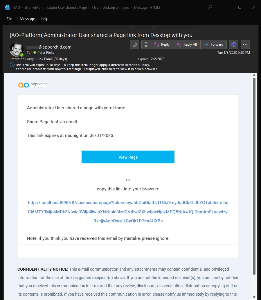 When a Solution Page is shared via email, the recipient user(s) will receive an email with the Share Page link. The email is template-based. The default template will look like this: