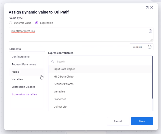 When clicked, the Expression Builder opens up allowing the user to enter the configuration for a Dynamic Value or an Expression. Click the Save button to save the configuration or Cancel to discard.