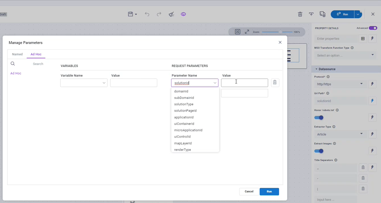 If Request Parameters and/or Variables have been configured for properties in a Pipeline or an Application, and the user selects to Run/Preview during configuration to test it, a dialog will be shown allowing the user to provide the required Variables or Request Parameters as input to the process.