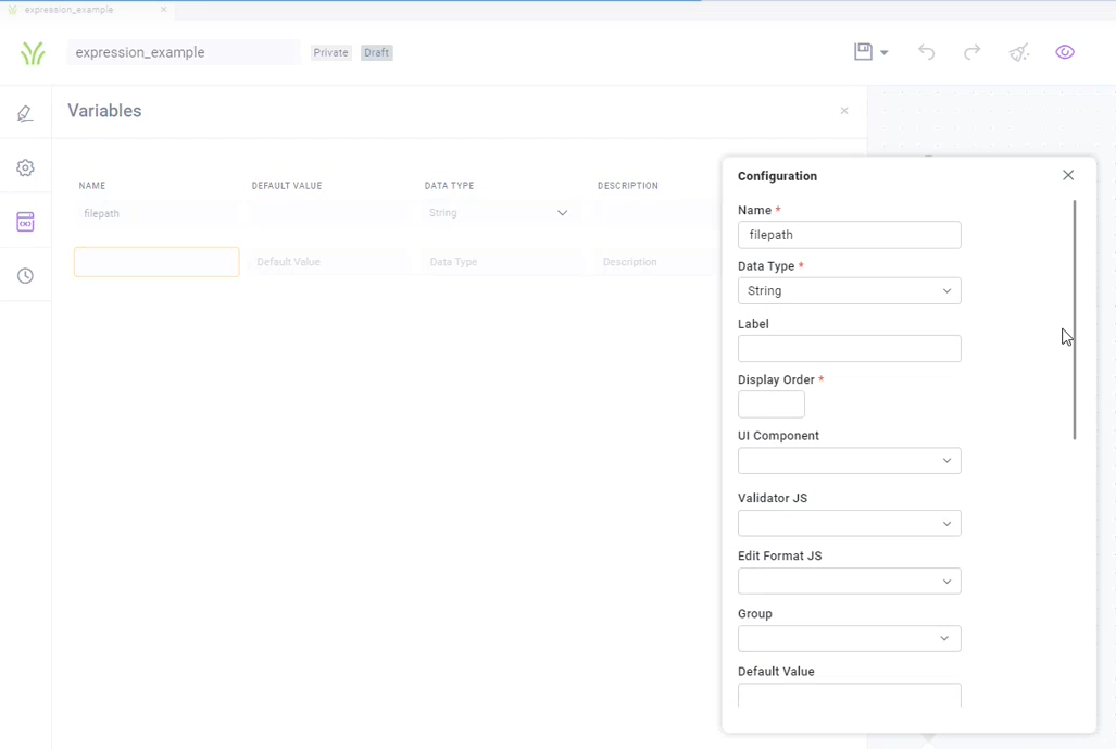 In order for Variables to appear as selectable Elements in the Expression Builder, the Variable(s) have to be configured first on the Variables page (on the left side of the Pipeline Composer). Multiple Variables can be added, each with a Default Value as well as many other properties determining the UI styling/formatting of the Variable.