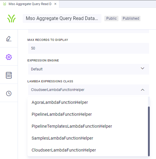 The Settings panel in the Pipeline Composer contains a dropdown for selecting a Lambda Expressions Class. Select the needed Expression Class in order for Lambda Functions to appear in Expression Builder.