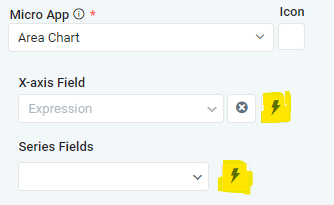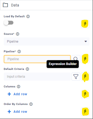 The Expression Builder is used in Pipeline Composer, Application Composer, Annotation Composers, and Model Composer to create a dynamic configuration for a particular property resolved at runtime. The options in the Expression Builder depend on the property for which the Expression Builder has been opened. The entry point for the Expression Builder is the lightning bolt icon next to many properties as seen in the example below.