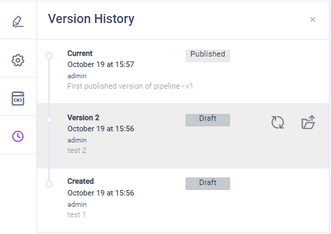 The Version History page will automatically be updated when a Composer object is saved as a Version explicitly or implicitly - essentially creating multiple different versions (or snapshots) of objects over time. Hover each entry in the Version History to select to: