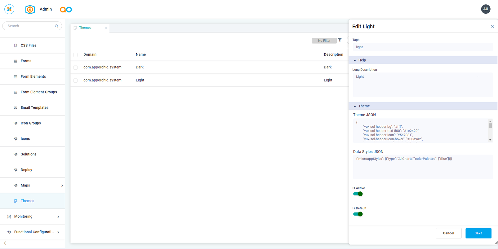 This topic provides insight into how to create and customize a UI Theme that can be applied to a Solution. A UI Theme defines the colors and styling of the user interface. The AO Platform provides two Themes out-of-the-box: Light and Dark.