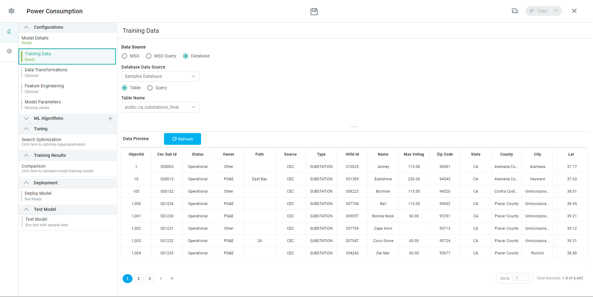 Data Preview | With the configuration of the Training Data done, a Preview of the data retrieved will be shown. Use the Refresh button to refresh the data in case configuration parameters are changed. |