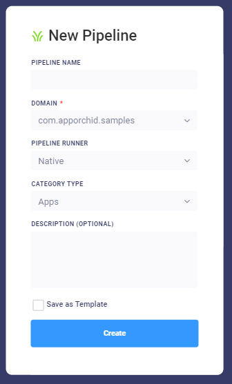 Domain - select the domain for the new Pipeline. As this is the name of the package for the domain, it’s typically expressed in the reverse domain name format: com.apporchid.samples.