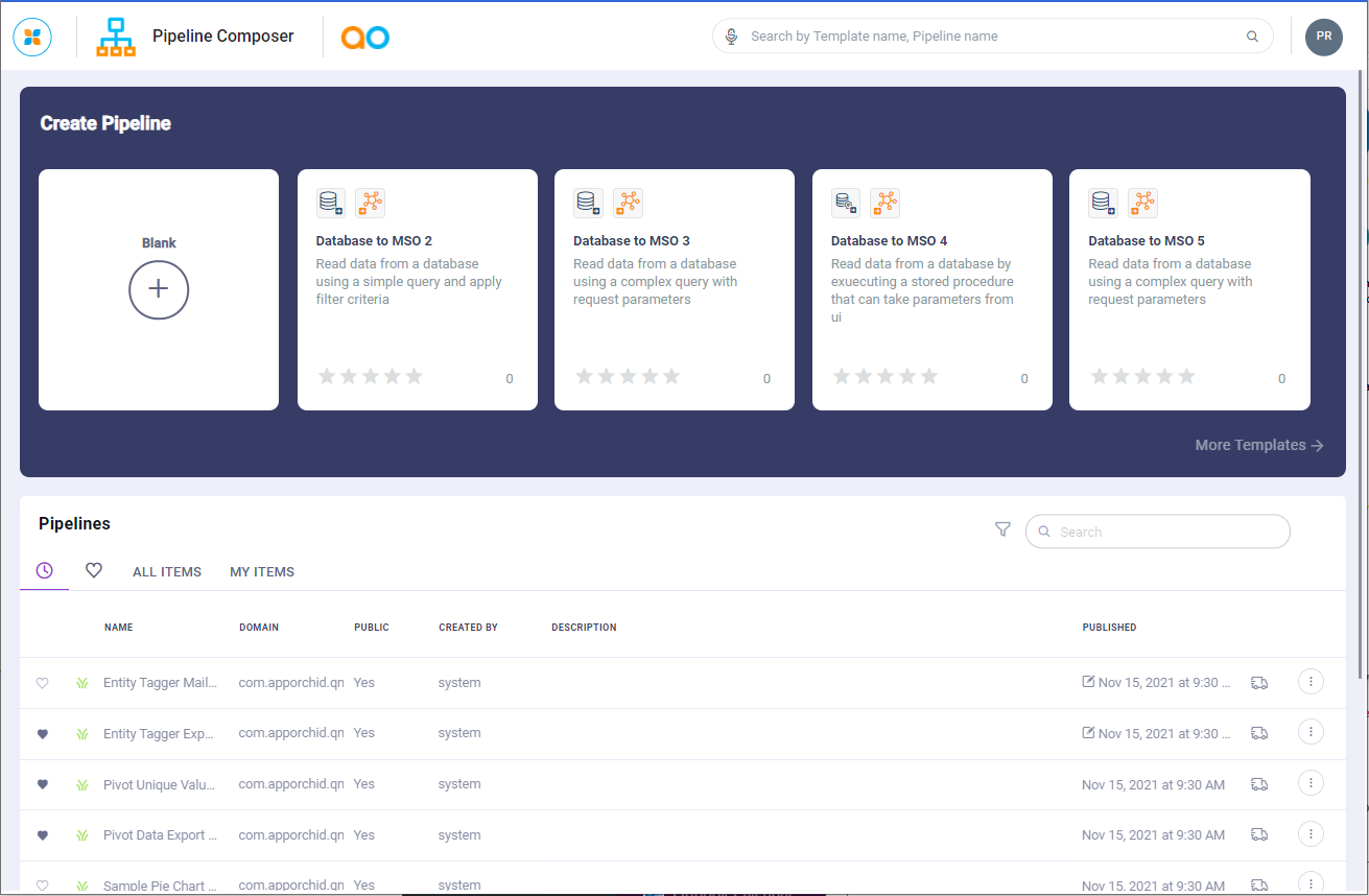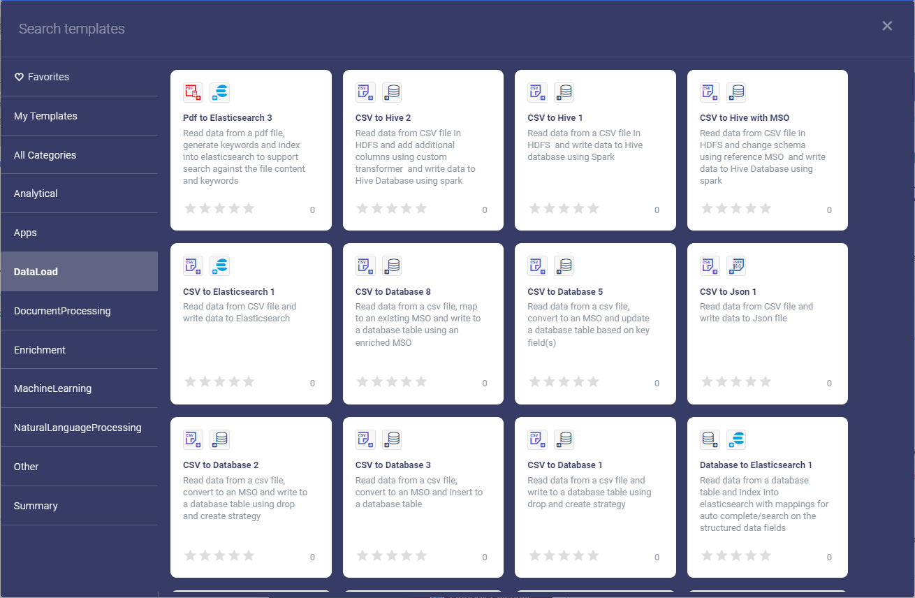 Creating a Pipeline using an existing Pipeline Template - this option will create a copy of the template selected. A template will typically include an existing working Pipeline with Datasource(s), Transforms, Sinks and/or Workflows. This greatly reduced the work needing to be done.