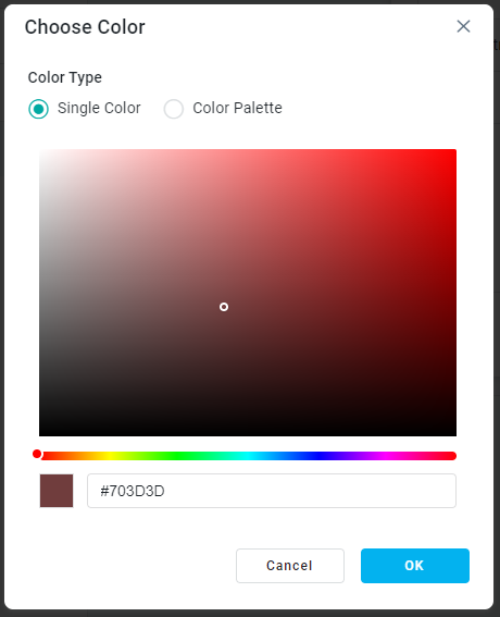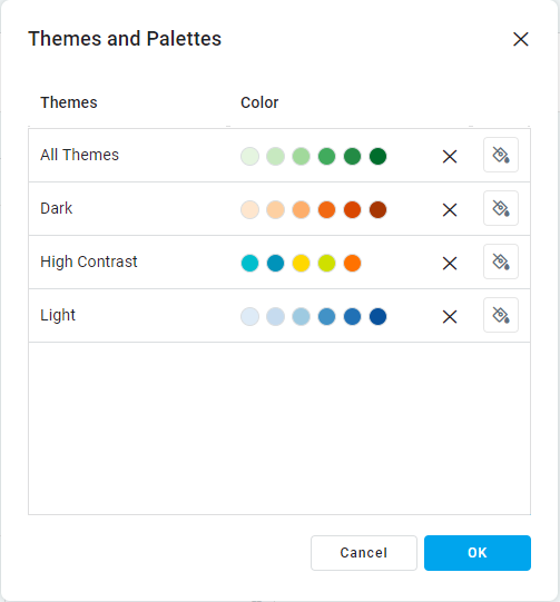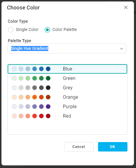 When any of the above Value Sources are selected to create a conditional color representation of the data from selected Field Properties, the Single or Color Palette choice made is done via the Themes and Palettes dialog. Once open, the user will see a list of preconfigured Themes available. A Single or Color Palette choice can be made for each Theme relating to the selected Field Property. Click the paintbrush icon to open the Choose Color dialog. Depending on the data type for the Field Property selected, Choose Color dialog will show options for Single Color, Color Palette, or both as seen in examples below.