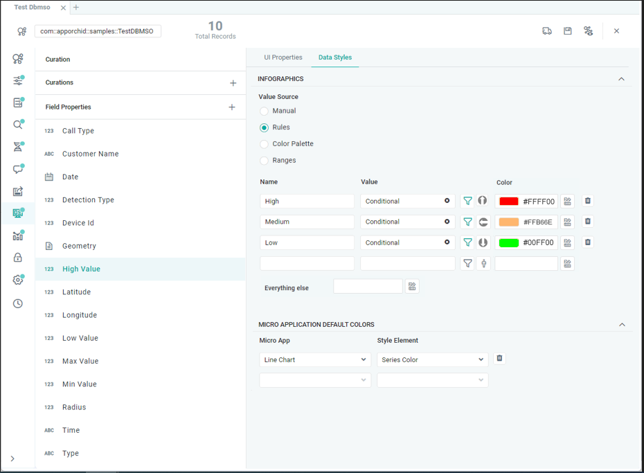 This is a repeater section where the above configuration of Colors can be applied to specific Micro Applications. If nothing is defined, the Micro Applications will be using the Data Style Colors associated with the Theme selected for the Solution.