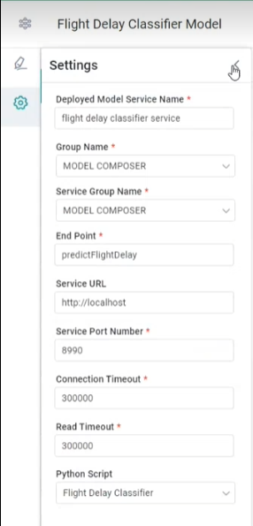 The Settings slideout panel allows the user to configure properties for the Model Composer, specifically relating to the deployment process.