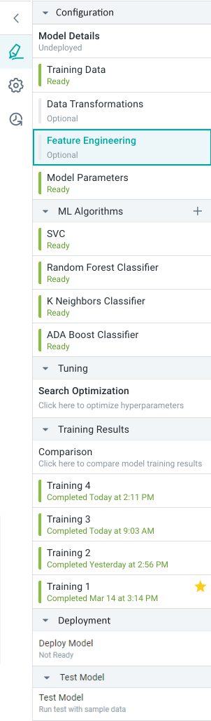 ML Algorithms - includes selection of one or more traditional Machine Learning Algorithms and configuration of associated parameters. ML Algorithms are directly linked to the Type of Models on the Model Details page. See the workflow in table below, and details on ML Algorithms > [Algorithm Name].
