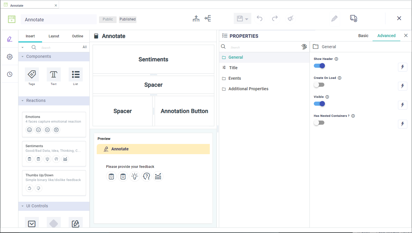 Use options in the left-side Palette panel to insert Annotation components, including Reactions and UI Controls, into the Layout cell(s) as well as updating any Layout organization.