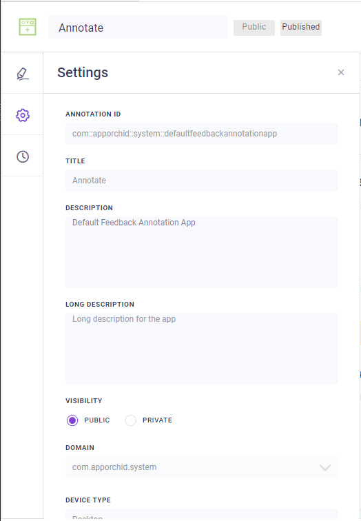 Device Type | Use the dropdown to select between Desktop and Mobile device types. This generally determines screen size/resolution for the Annotation. This property can only be set in the Create dialog when creating a new Annotation. |