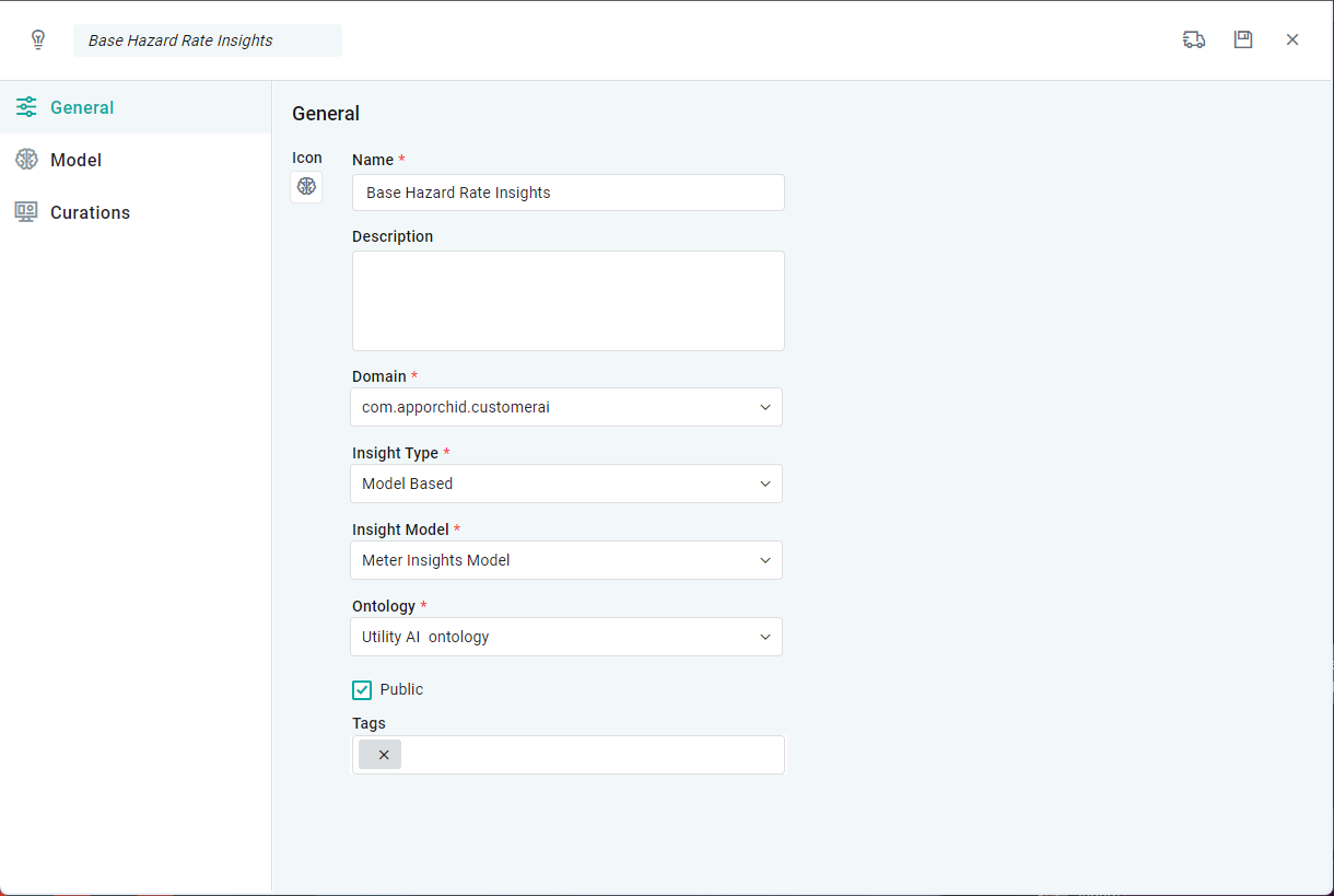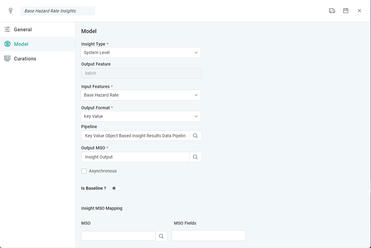Output Feature | Property comes from Input Features MSO via dropdown, and identifies the core output from the Insight Model, eg. “Meter Failure". This is a read-only property on the Model page as it can only be configured in the Insight Model Configuration for the Insight Model selected. |