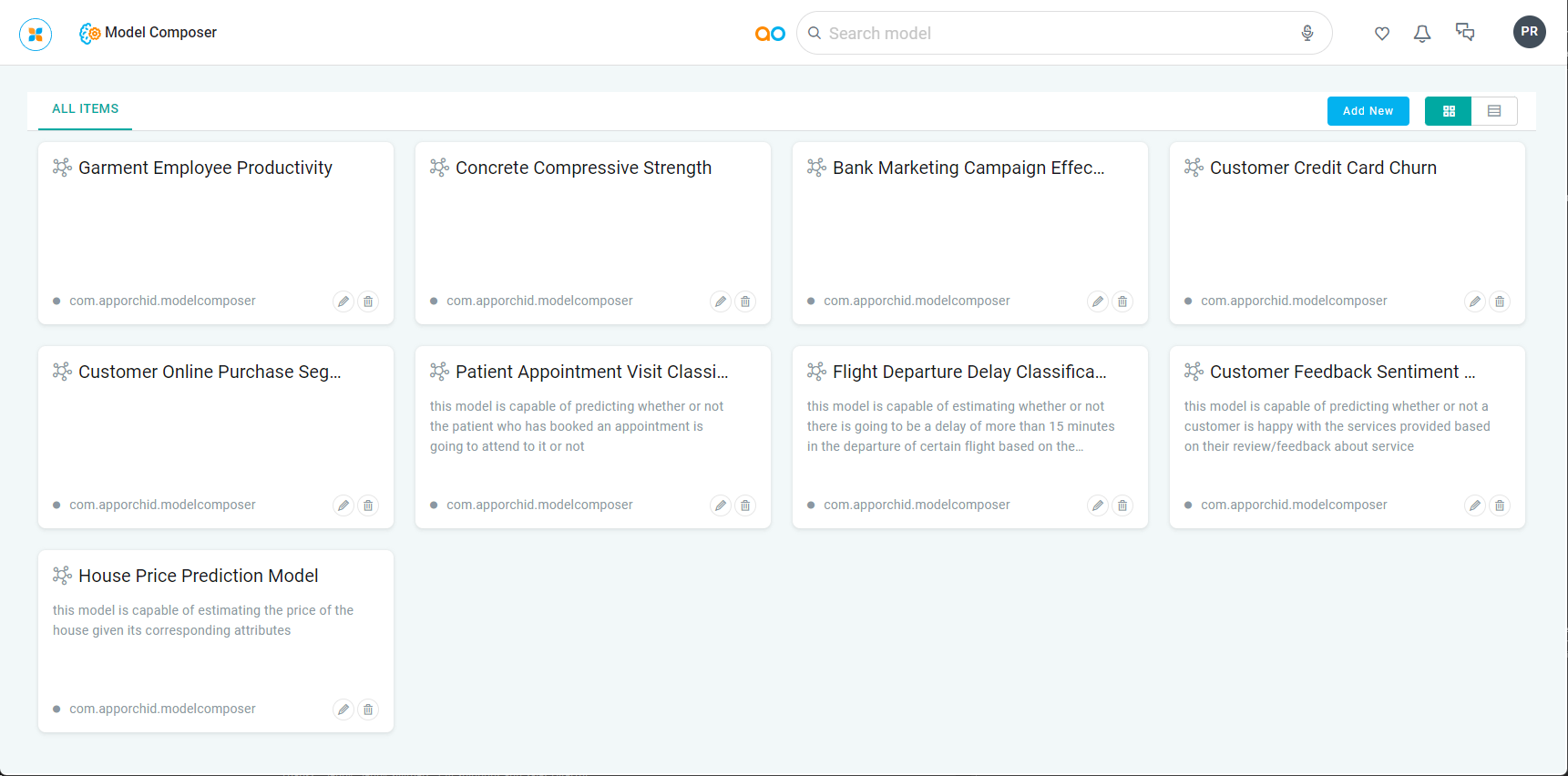 When selecting the Model Composer, the user will see any existing Models in either a Card view or a List view.