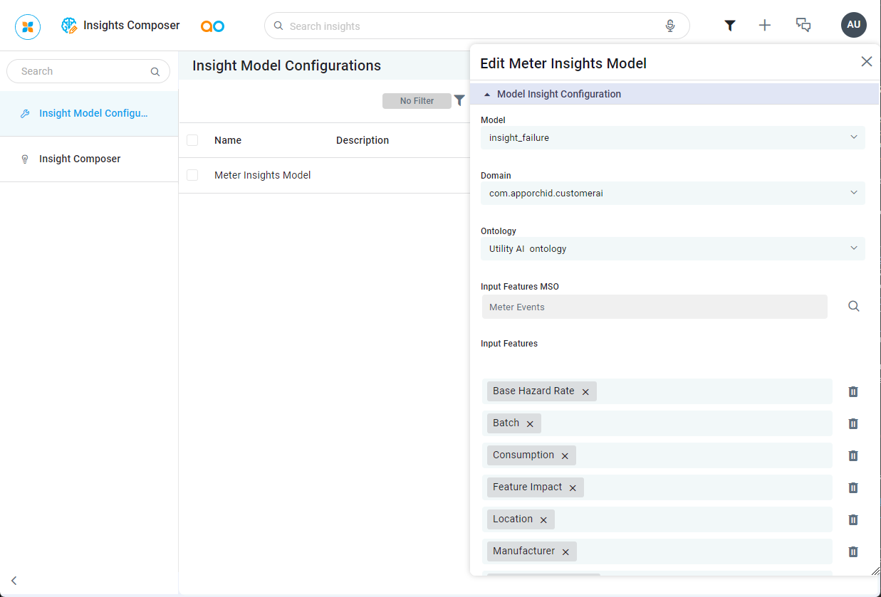 When selecting the Insight Model Configurations page in the Insights Composer, a list view of existing Insight Model Configurations (if available) will be shown.