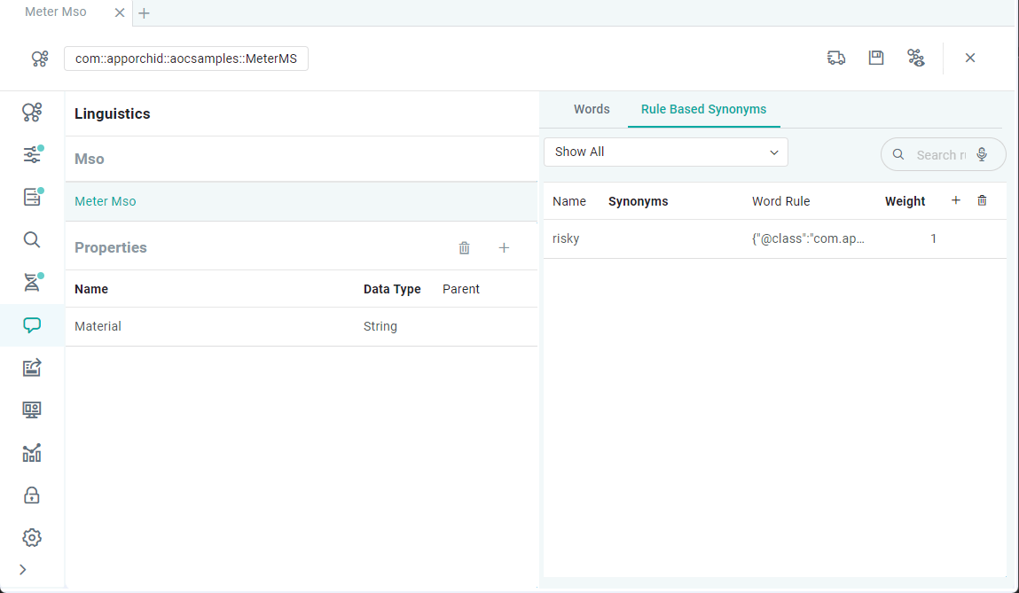 Word Rule | Add a Word Rule for the Word being configured. A Word Rule makes use of the Using Query Builder to allow users to establish one or more criteria being considered when the Word is used, eg. if a Word “risky” is configured relating to the “meter” MSO, the criteria could be configured to relate to a specific “Manufacturer” and “Material”, ie only those Meters from a specific Manufacturer and made of a specific Material will be shown if user asked the question: “Show all risky meters”. |