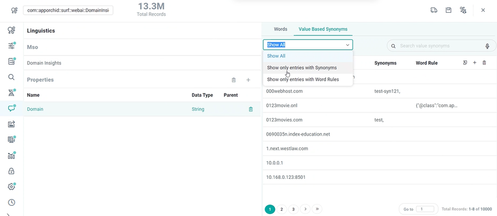 Once Value-Based Synonyms have been added, the user can search for specific Synonyms or filter the list of Synonyms based on the following options: