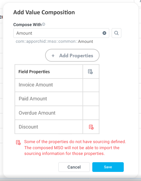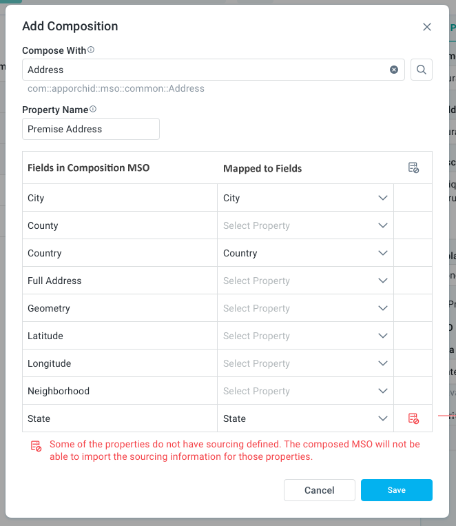 Sourcing | Icon | Shows a red icon if Sourcing is not available for the Fields being mapped. Also, the following red text will be shown at the bottom of the Fields list: Some of the properties do not have sourcing defined <sourcing icon>. The composed MSO will not be able to import the sourcing information for those properties. |