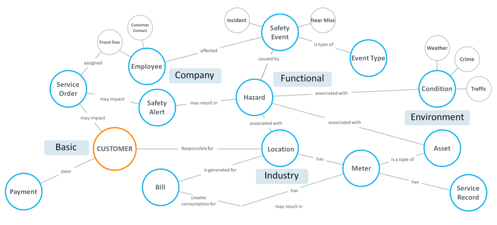 An example Ontology graph from a Utility company showing a “digital twin of the business”, including how the business entities are related to each other.