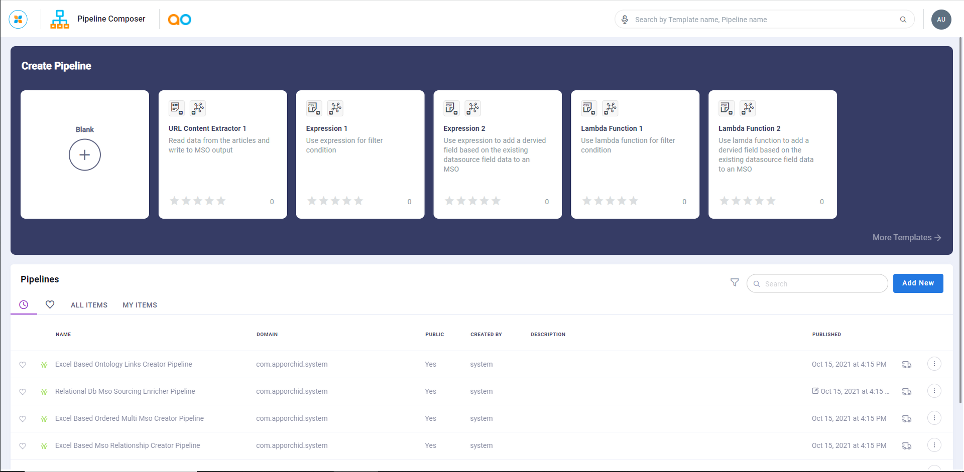 The Pipeline Composer is the key user interface to configuring access to, querying and transforming data when developing an enterprise AI application with the AO Platform. All other Composers in the AO Platform are building on the foundation of the data pipelines.