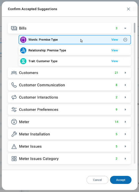 The Show Suggestions dialog is available from both the Action menu on the Ontology Card as well as the Action menu on the individual MSO Cards. The dialog shows all the suggestions for further enrichment of the MSOs found during the Ontology/MSO Discovery process allowing the user to either Accept or Reject each suggested item. This topic focuses on the Show Suggestions options for individual MSOs.