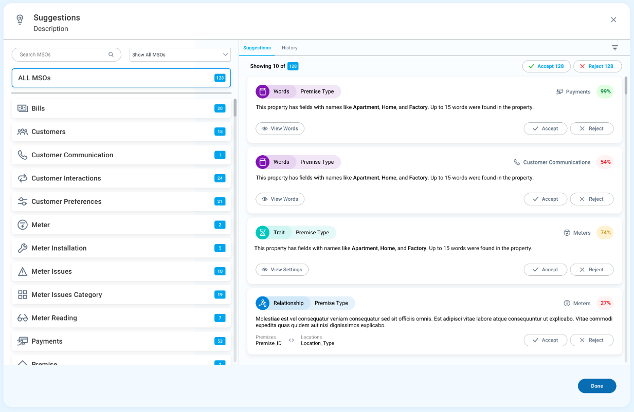 Some suggested items may have additional options to allow the user to view details about the suggestion before accepting or rejecting it. Also, a confidence score will be displayed for some items to guide the user of the relevance/accuracy of the suggestion.