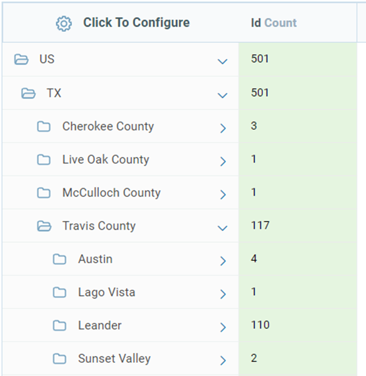 Hierarchical Fields | Repeater section for Hierarchical Fields selection from dropdown. Will be used to create a hierarchical view of the data, eg. Country, State, County, City, … |
