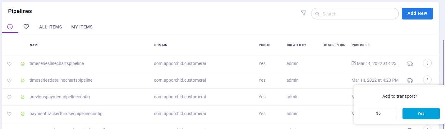 The first step in a transfer is to select the component(s) that is/are to be transferred to a different environment. This step is identified by the Transport icon :transport-tool: available across all Composers. Once a component has been selected for transport, the task can be reverted by selecting the icon again.